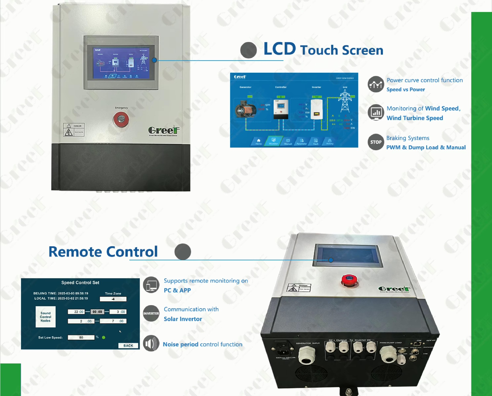 Horizontální turbína s generátorem 3 kW, 5 kW a 10 kW, vyšší výkon s vysokou účinností díky novému systému Wind Grid-tie regulátoru přímo pro tento generátor GREEF, s invertorem, stožárem do 6, 8 až 12 metrů a kompletní montáží komponent na klíč.